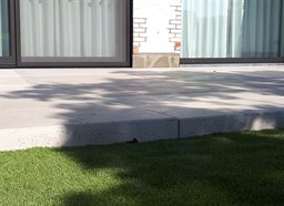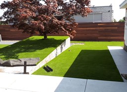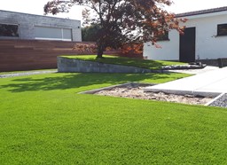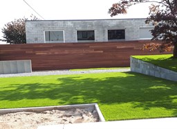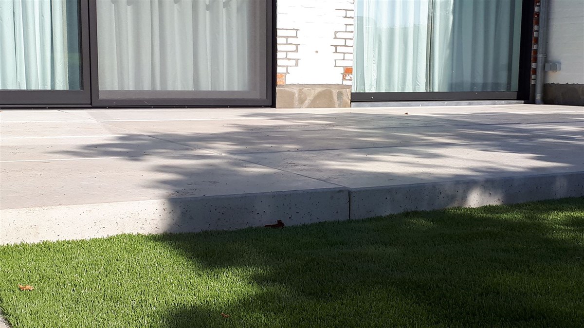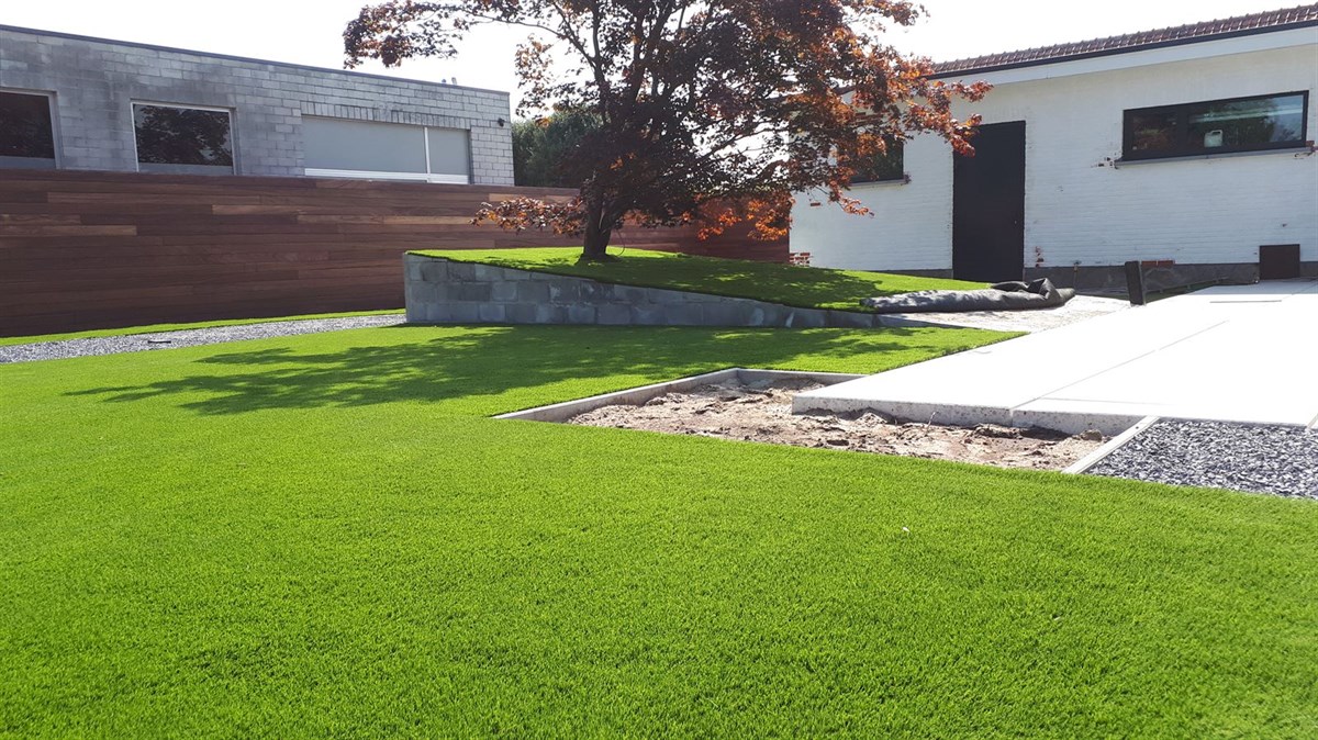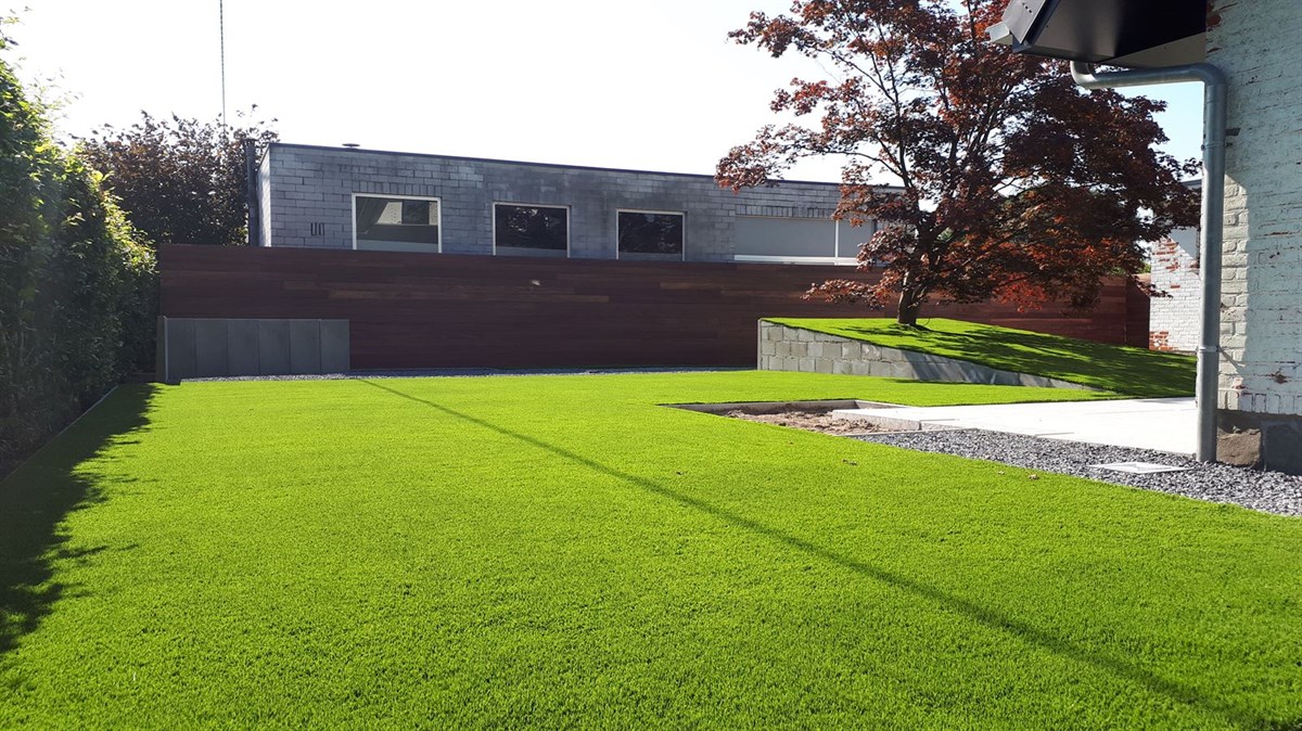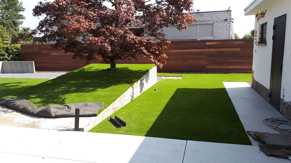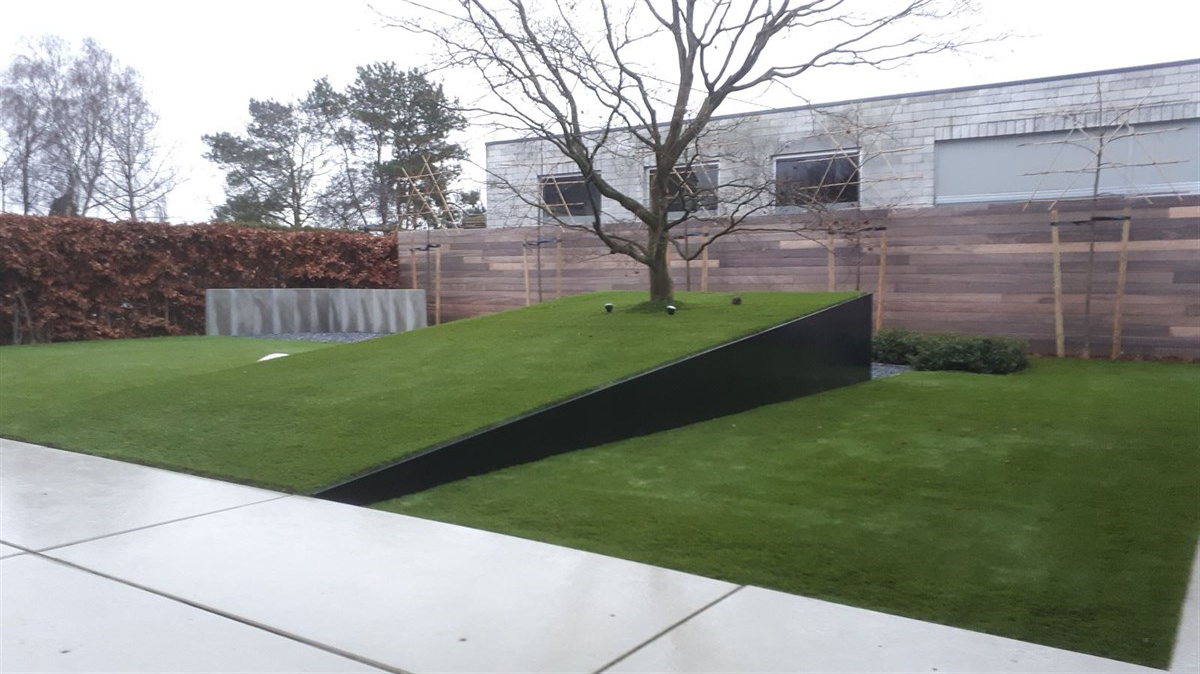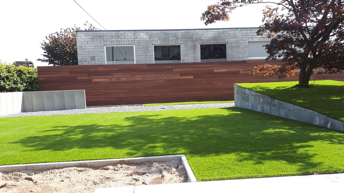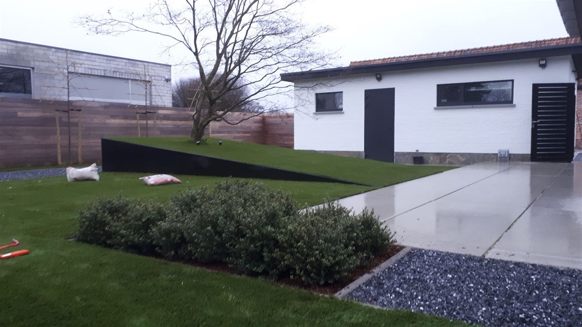 De bestaande rode esdoorn werd als het ware samen met een stuk van het kunstgras uit de grond gelift en de achterliggende garage werd aan het zicht onttrokken met een hardhouten muur in combinatie met leibomen. Het ruime terras is uitgevoerd in grootformaat Eurodal-tegels wat het geheel een robuust kantje geeft. Dit alles gecombineerd met enkele strategisch geplaatste groenblijvende elementen vormt de basis van de achtertuin.