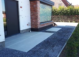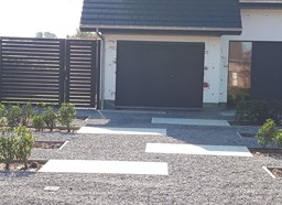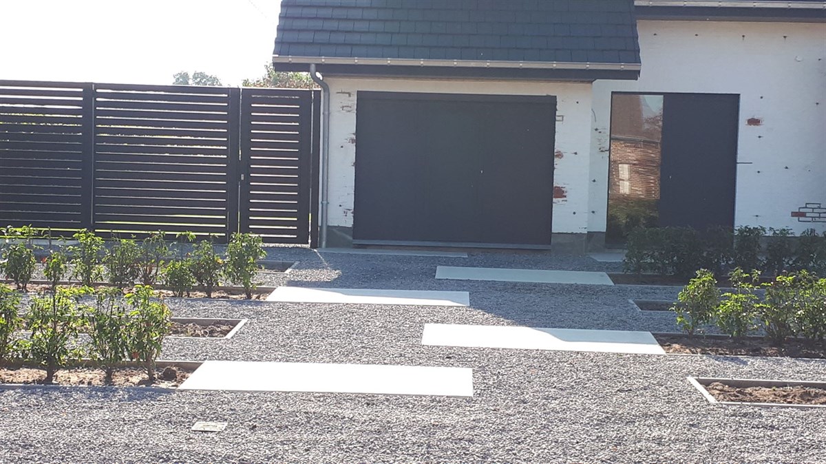 De voortuin werd eveneens onderhoudsvriendelijk gehouden. Enkele strakke lijnen van portugese laurier en halfhoge rechtopgaande siergrassen vormen de basis. Dit alles in combinatie met donker siergrind en grote Eurodal-tegels zorgt voor een rustig maar speels geheel.
