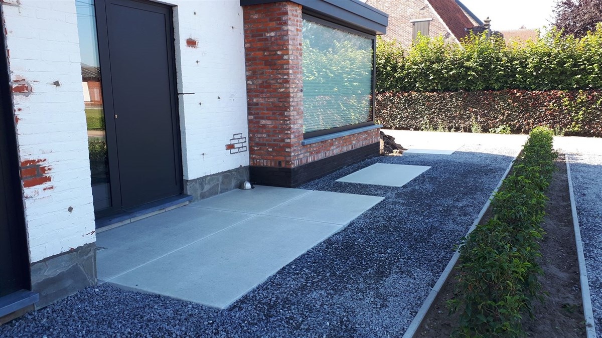 Op vraag van de bewoners werd een out-of-the-box ontwerp uitgewerkt. Dit ontwerp trekt de strakke lijnen van binnen door naar buiten zodat alles één mooi geheel vormt. Onderhoudsvriendelijk, strakke lijnen en verschillende hoekjes om optimaal te genieten van iedere zonnestraal waren de uitgangspunten.