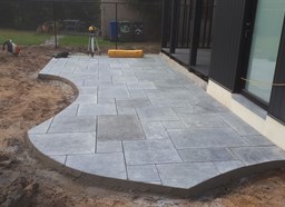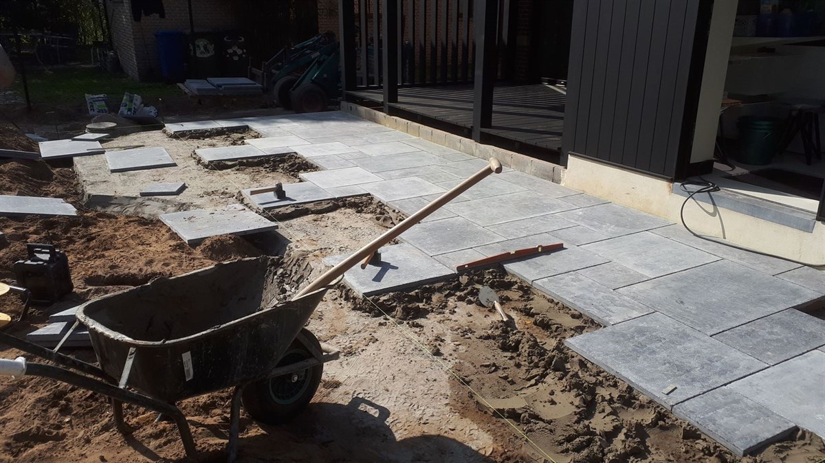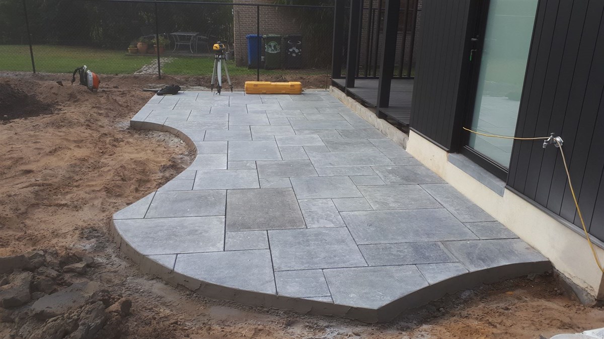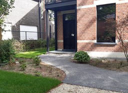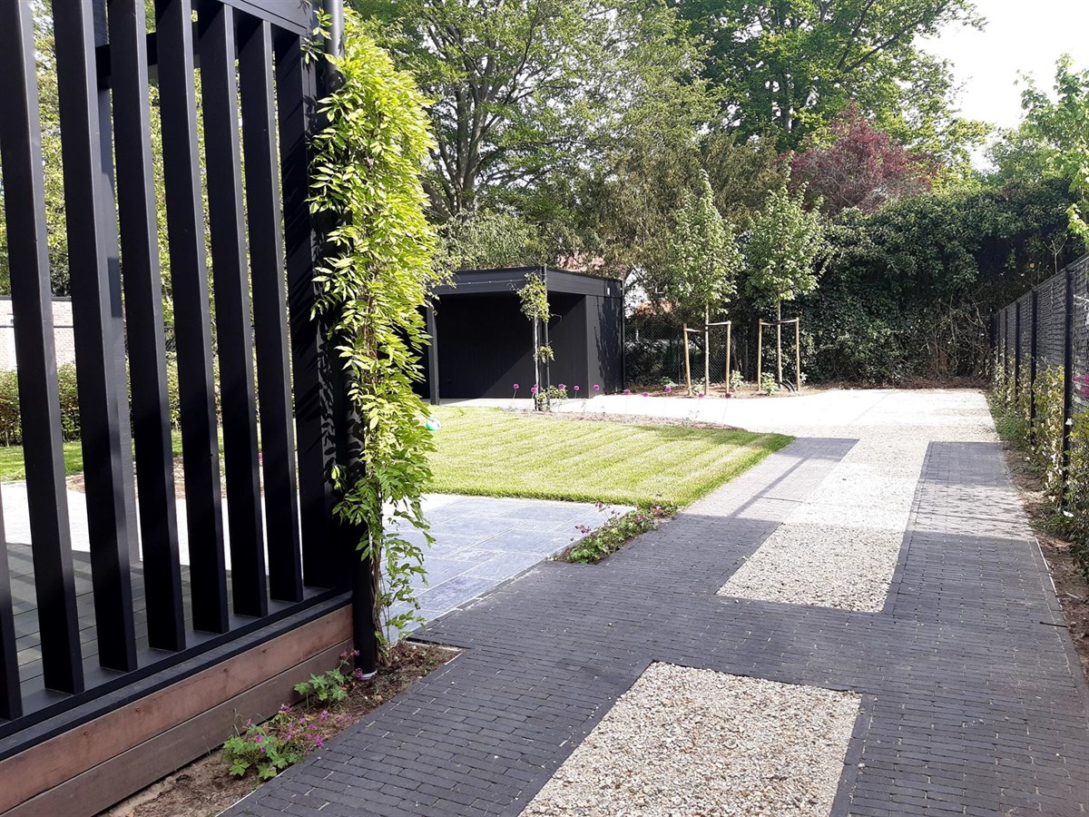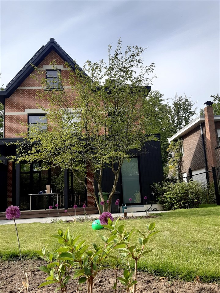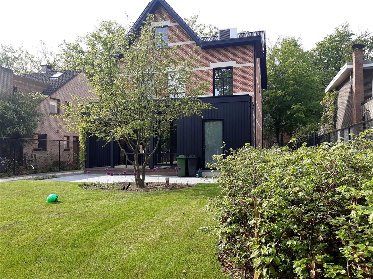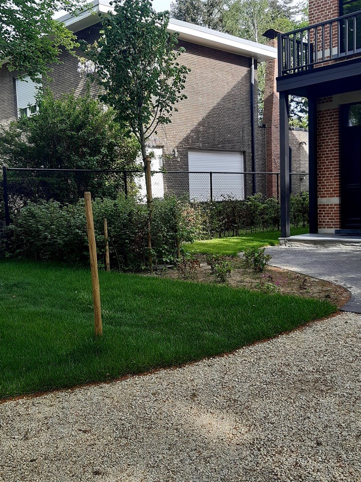 Er werd gekozen voor een high-end afwerking met duurzame materialen. Enkele volwassen bomen geven het nodige cachet aan deze nieuwe tuin. De afgeronde vormen in zowel beplanting als terras en tuinpad zorgen voor de speelse toets bij de verder statige, impressionante herenwoning.