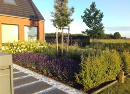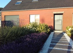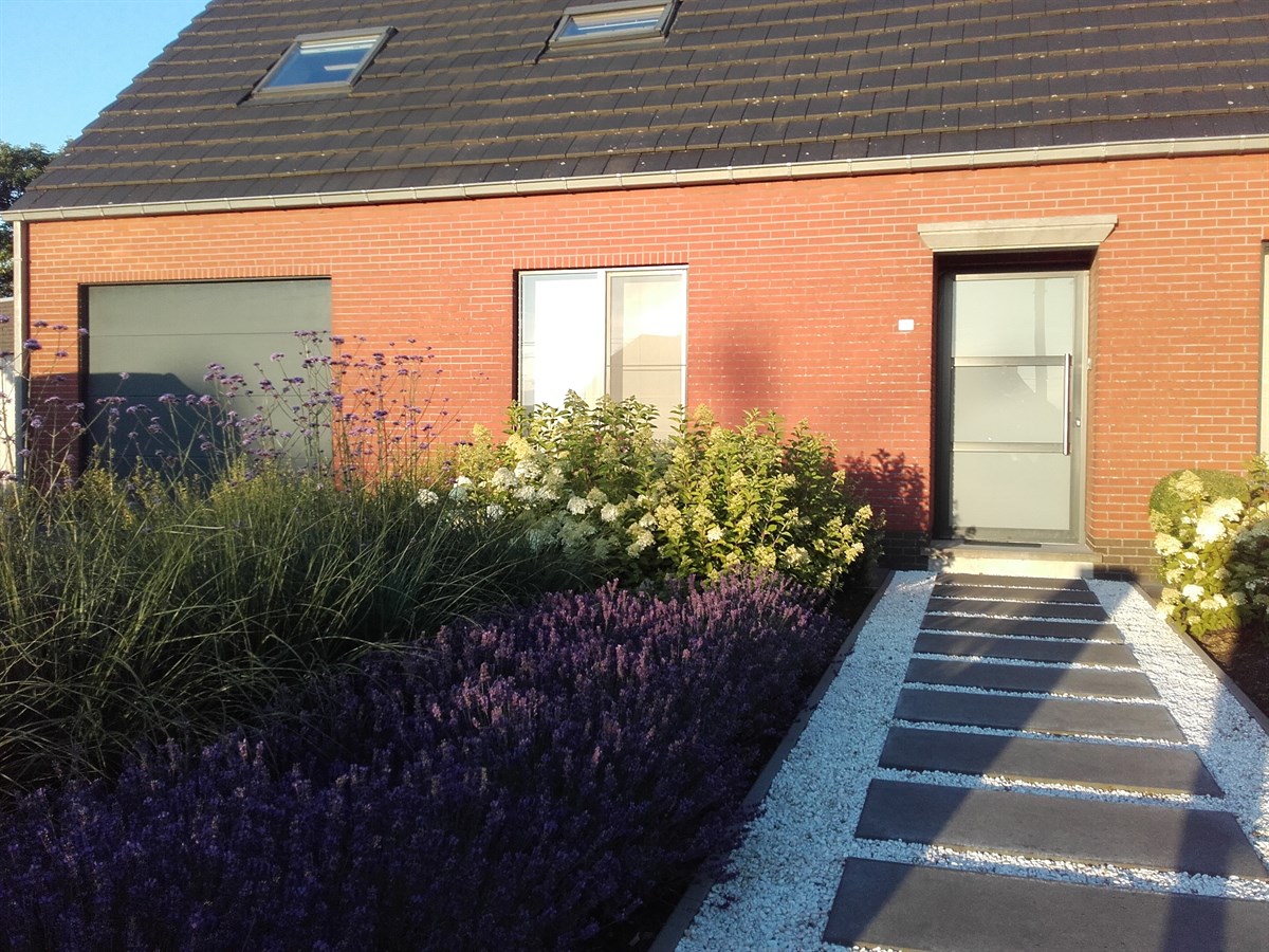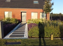 Na de verbouwingswerken binnen in huis was de leuze: nieuwe bewoners, nieuwe wetten. Om deze reden werd dus ook het terrein rondom de woning grondig aangepakt. Een strak kiezelpad met stapstenen zorgt voor de juiste ontvangst van bezoekers.