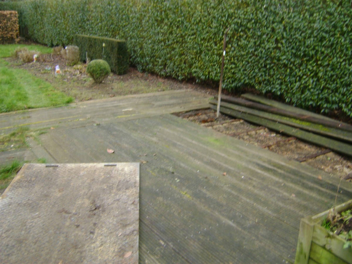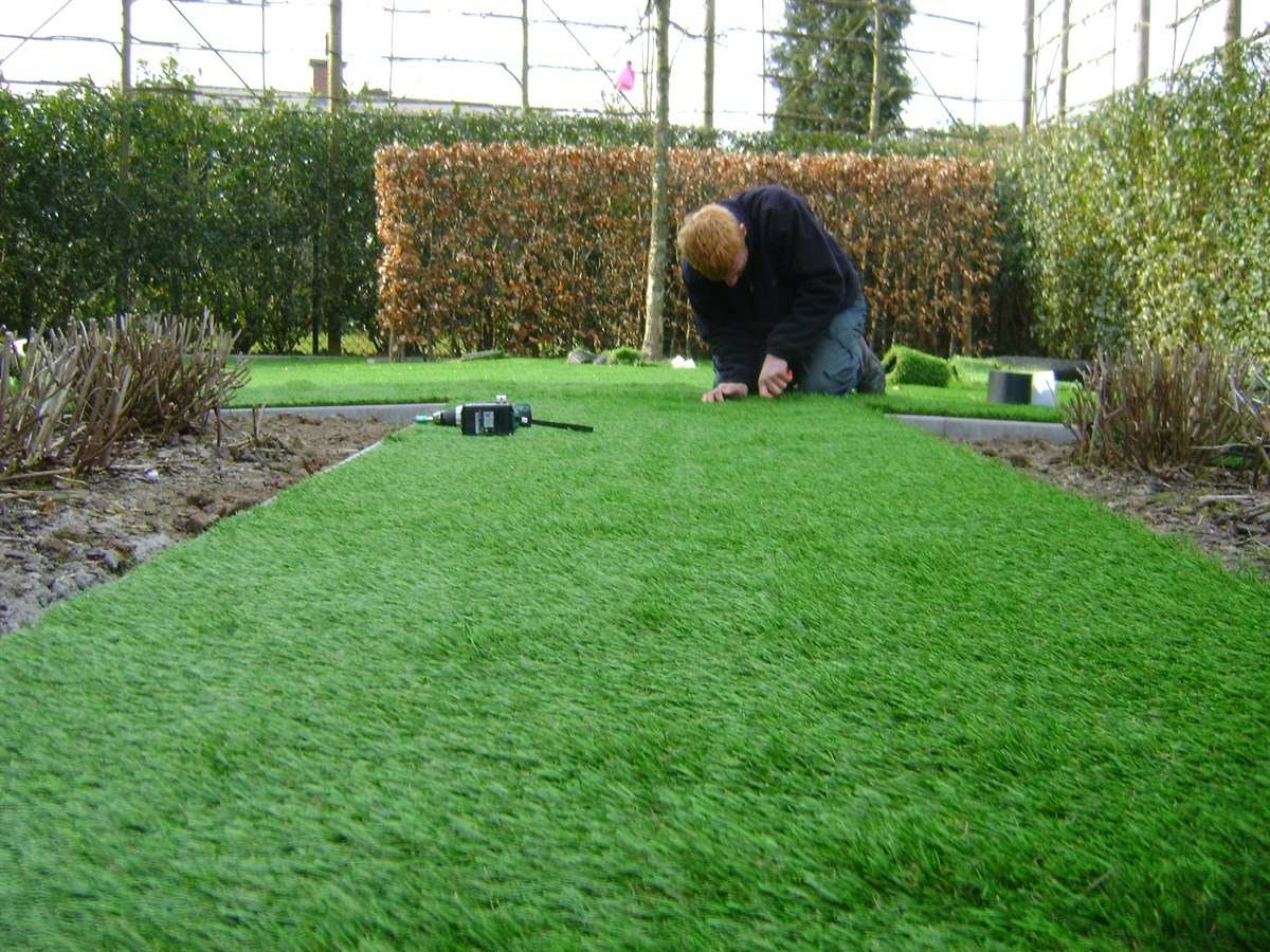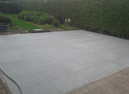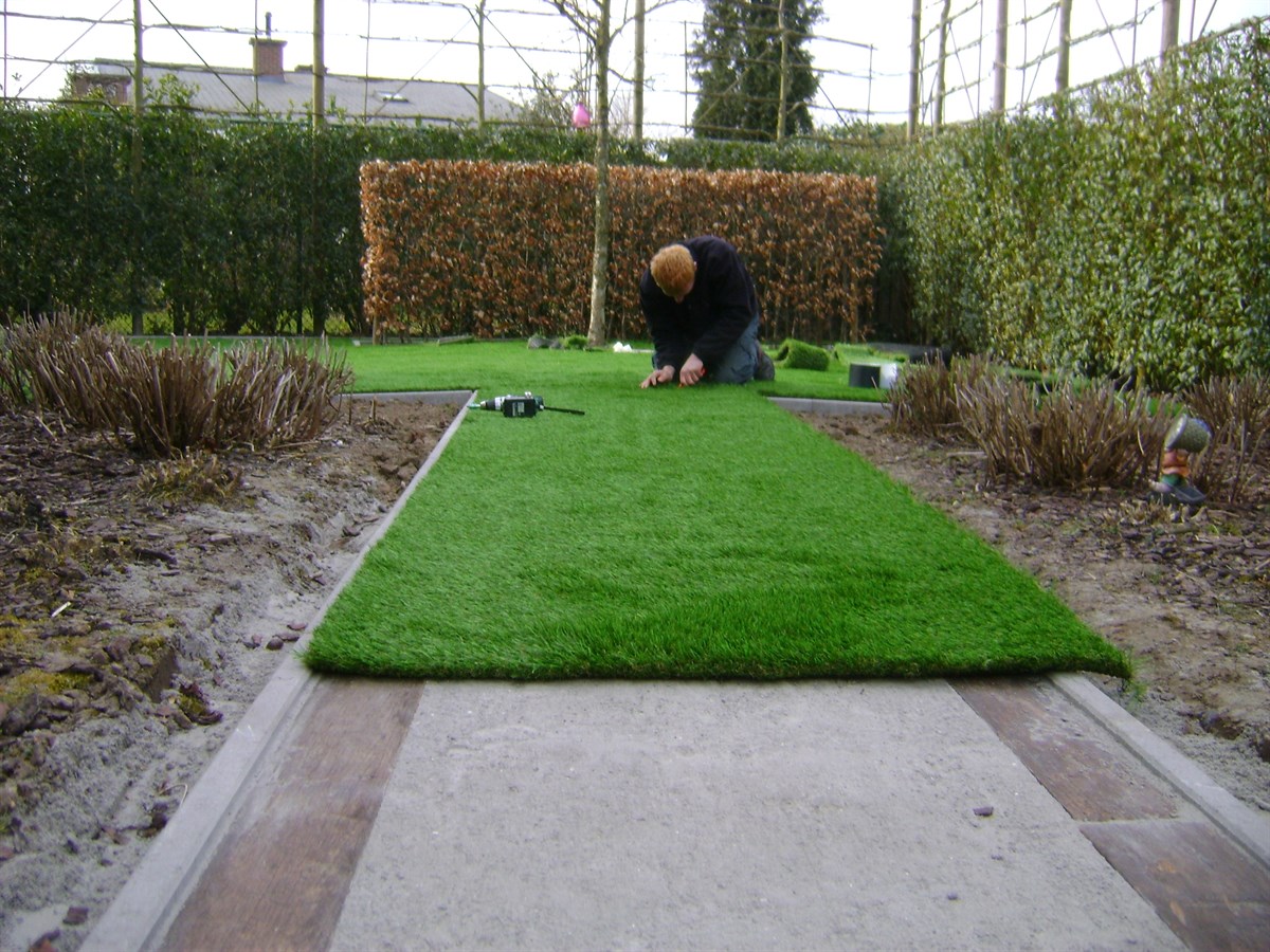 In een tweede fase, enkele jaren na de aanleg van de tuin, wou de eigenaar het natuurlijke gras vervangen door kunstgras en het oorspronkelijke terras in bankirai vervangen door een terras in keramische tegels. Om dit te realiseren werd eerst het volledige geheel uitgevlakt met gestabiliseerd zand om vervolgens het kunstgras en de tegels te plaatsen. Op deze manier is nu een knusse stadstuin gecreëerd met een minimum aan onderhoud.