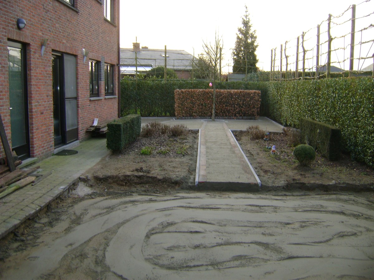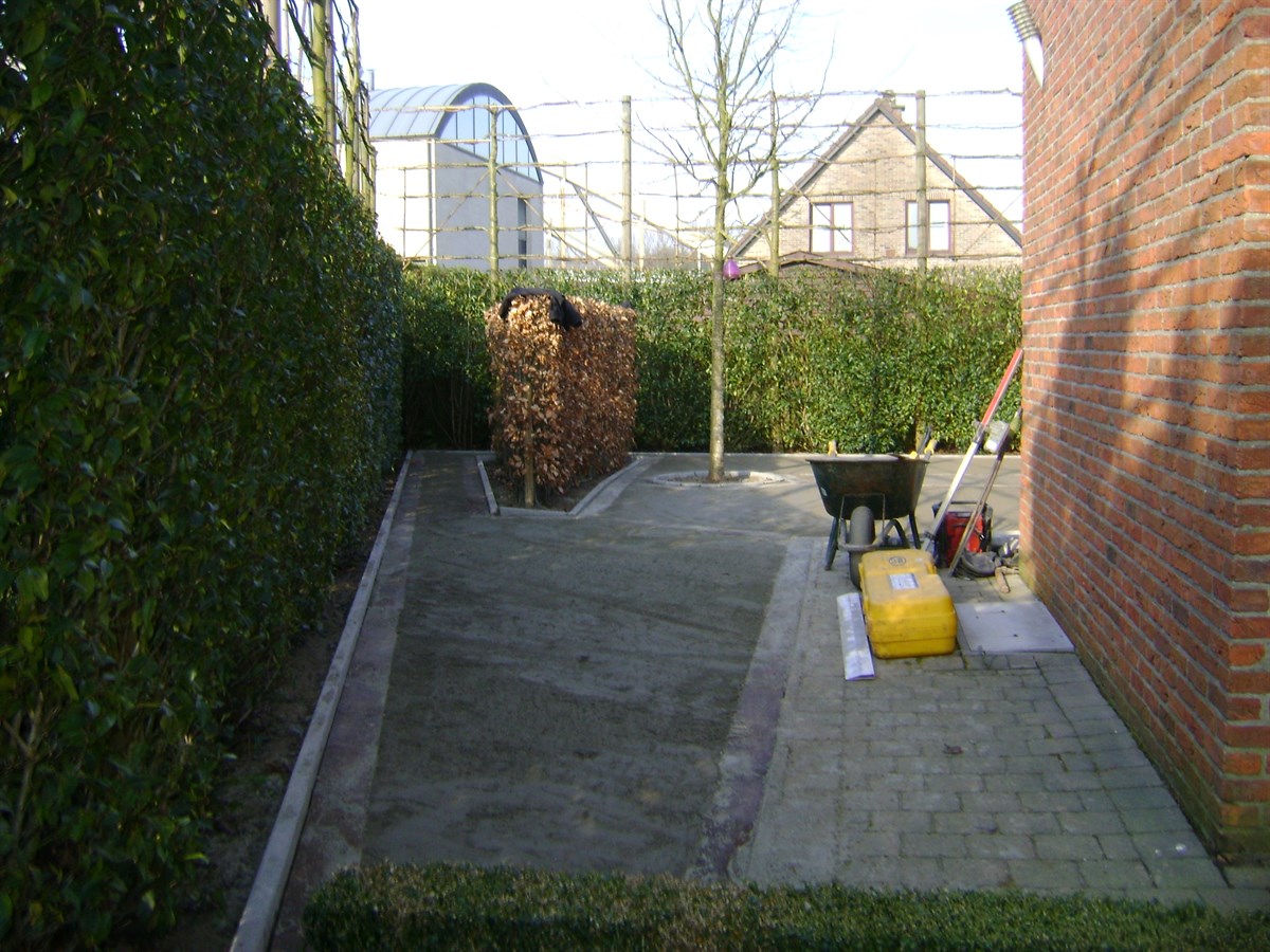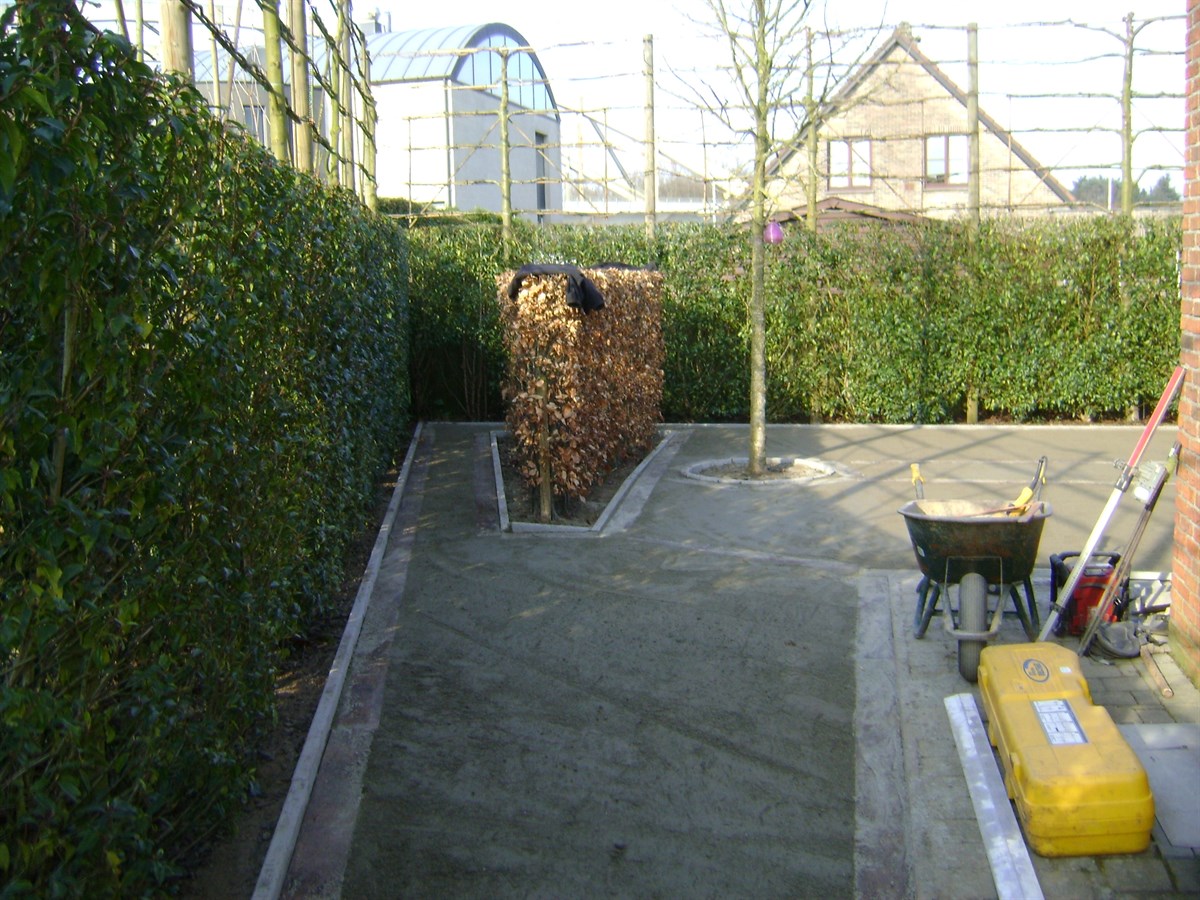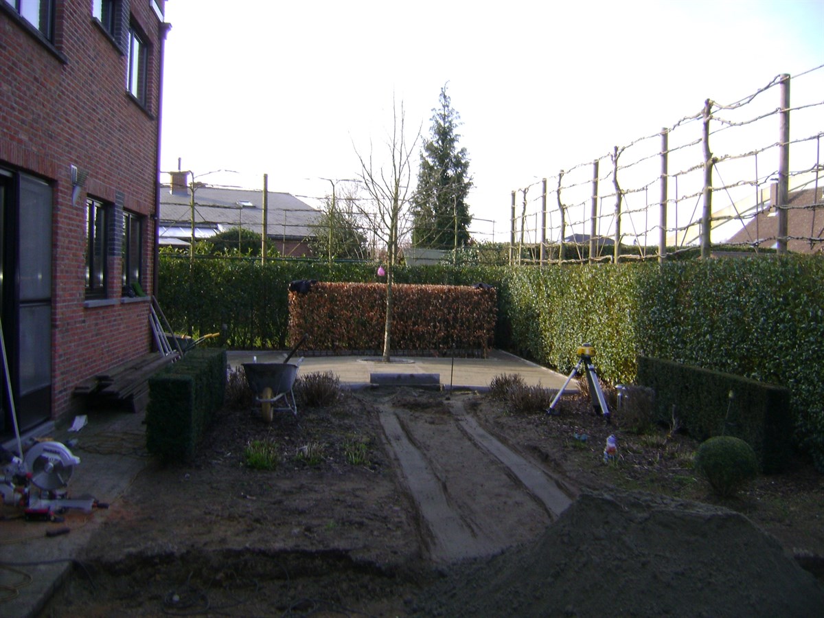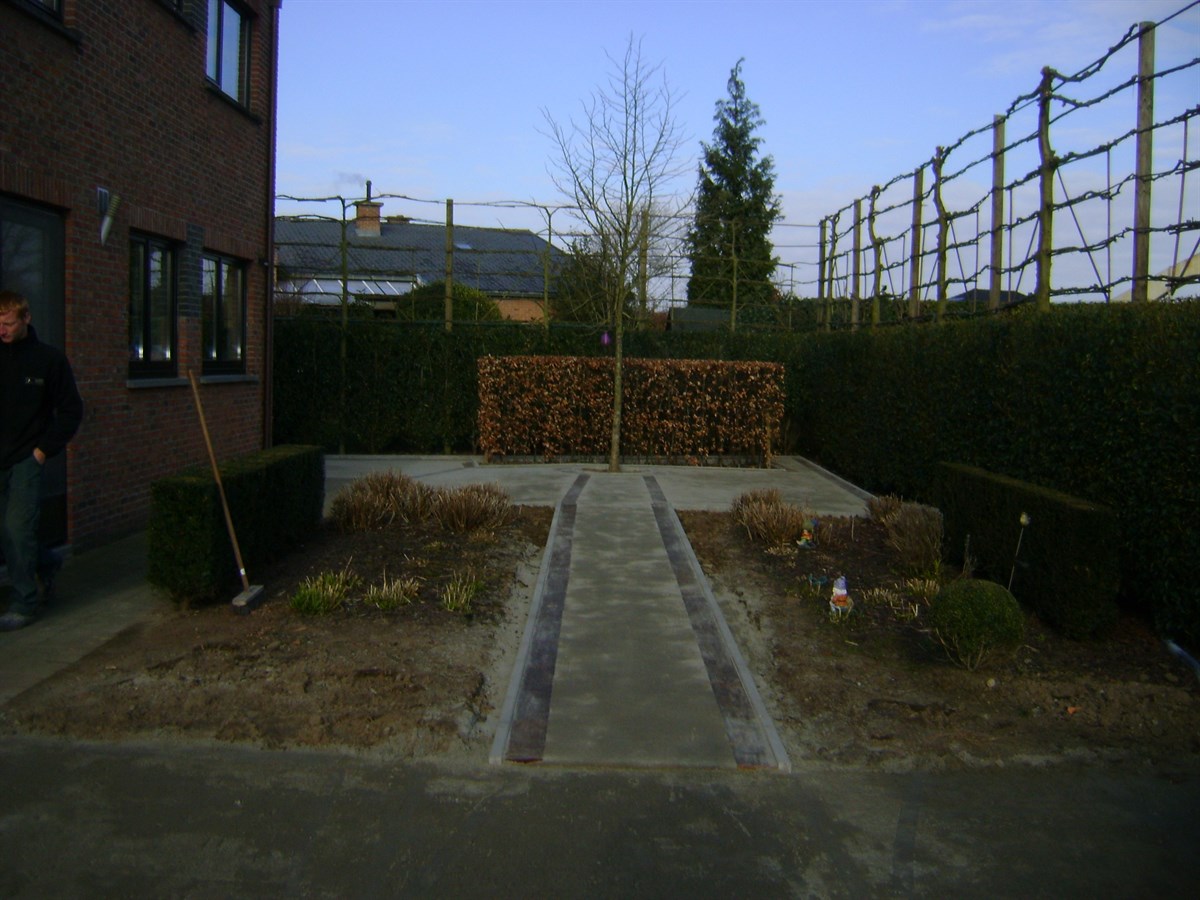 De tuin rond deze woning is gerealiseerd in twee fases. De eerste fase bestond uit de volledige tuinaanleg rondom, exclusief verhardingen. De bestaande tuin werd volledig opgebroken en een nieuwe werd aangelegd. Door de drukke agenda van de bewoonster, werd gekozen voor beplanting welke snel dichtgroeid. Op deze manier wordt de onkruiddruk verminderd. Door te werken met leibomen wordt de privacy van de bewoonster verzekerd.
