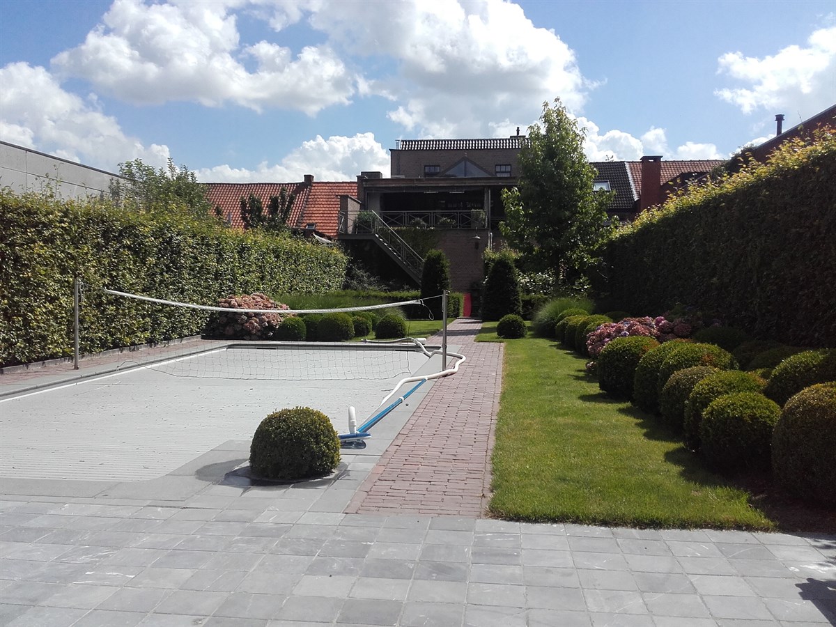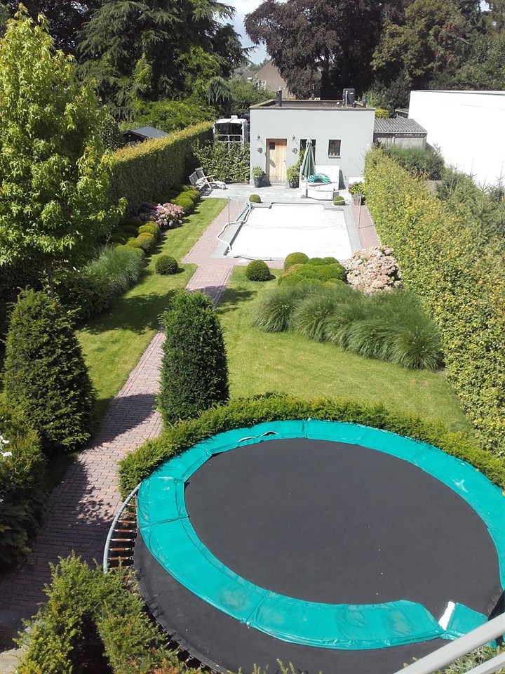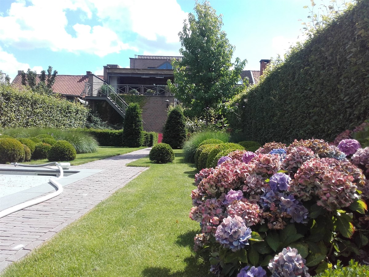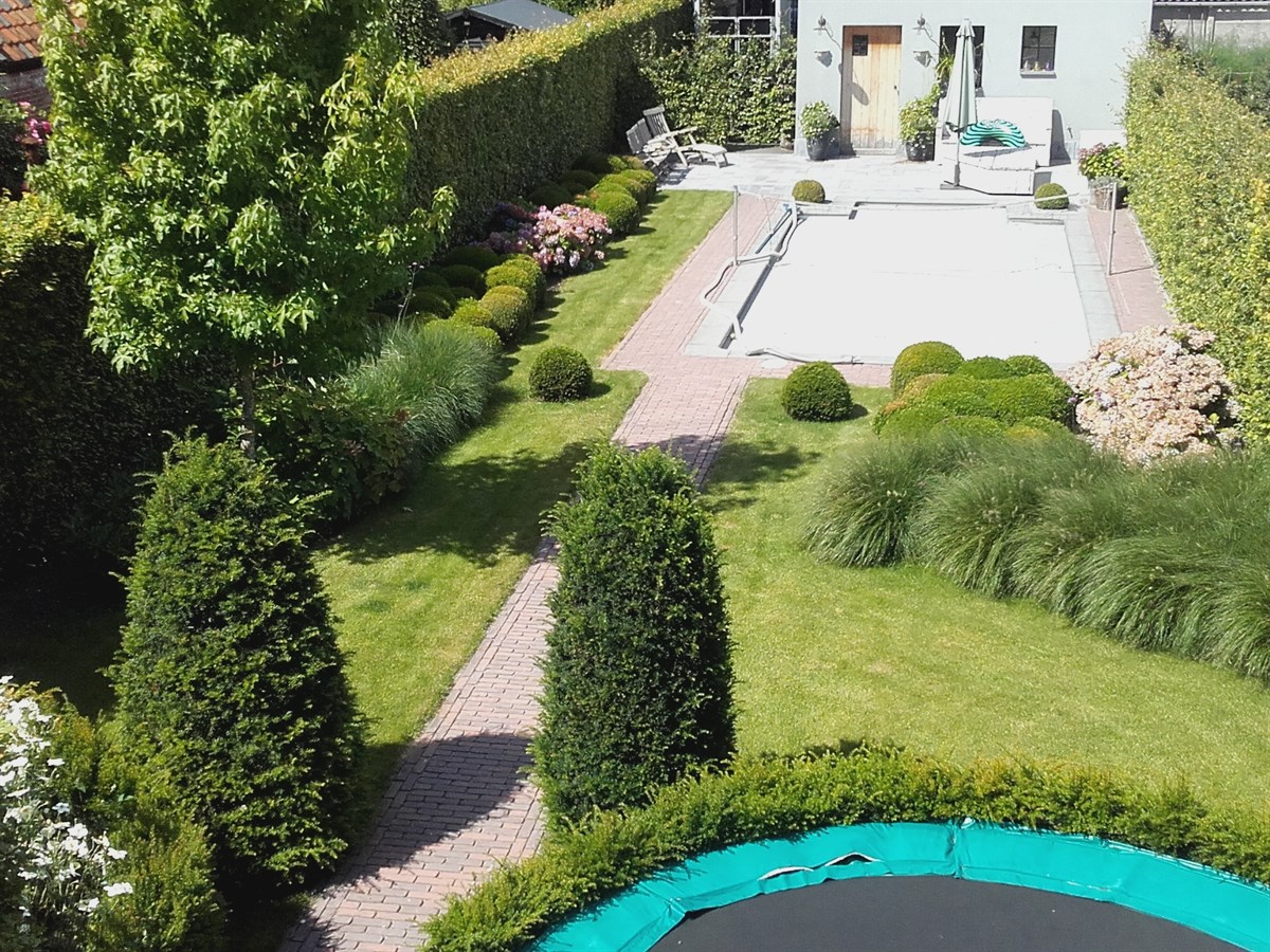 Bij deze landelijk ogende woning was het de opdracht het bestaande zwembad te integreren in een overzichtelijke open tuin met een minimum aan onderhoud. Door gebruik te maken van enkele groenblijvende buxusmassieven en twee grote taxuskegels en taxushagen, behoudt de tuin zijn structuur in de winter. Verder is vooral gebruik gemaakt van siergrassen en hortensia's voor de kleuraccenten. Het gazon sluit aan bij zowel het zwembad als het terras om de speelruimte van de kinderen ze ruim mogelijk te maken.