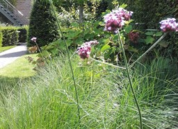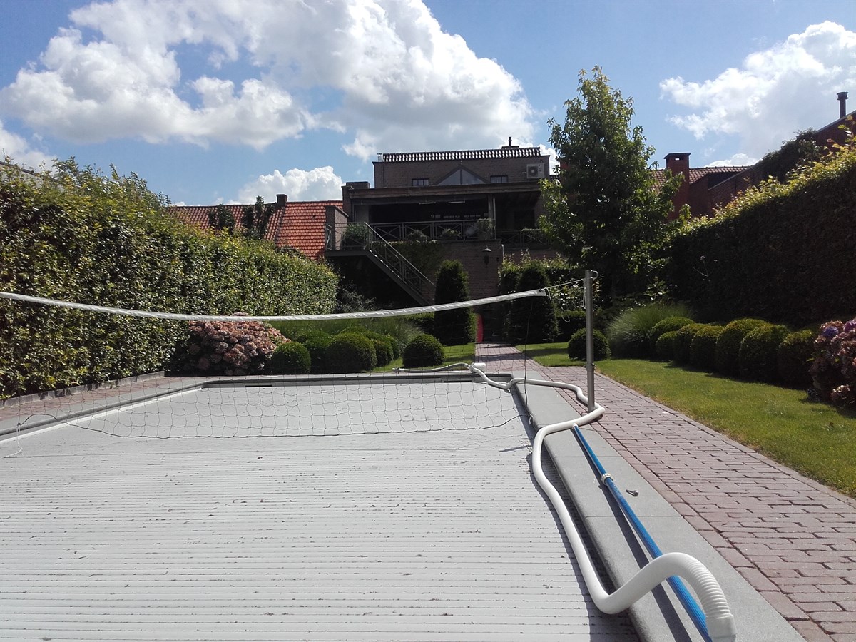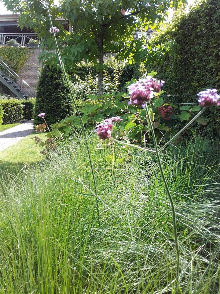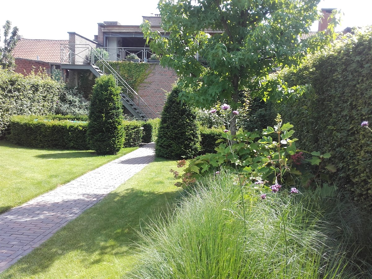 Bij deze landelijk ogende woning was het de opdracht het bestaande zwembad te integreren in een overzichtelijke open tuin met een minimum aan onderhoud. Door gebruik te maken van enkele groenblijvende buxusmassieven en twee grote taxuskegels en taxushagen, behoudt de tuin zijn structuur in de winter. Verder is vooral gebruik gemaakt van siergrassen en hortensia's voor de kleuraccenten. Het gazon sluit aan bij zowel het zwembad als het terras om de speelruimte van de kinderen ze ruim mogelijk te maken.
